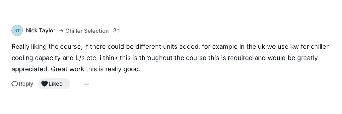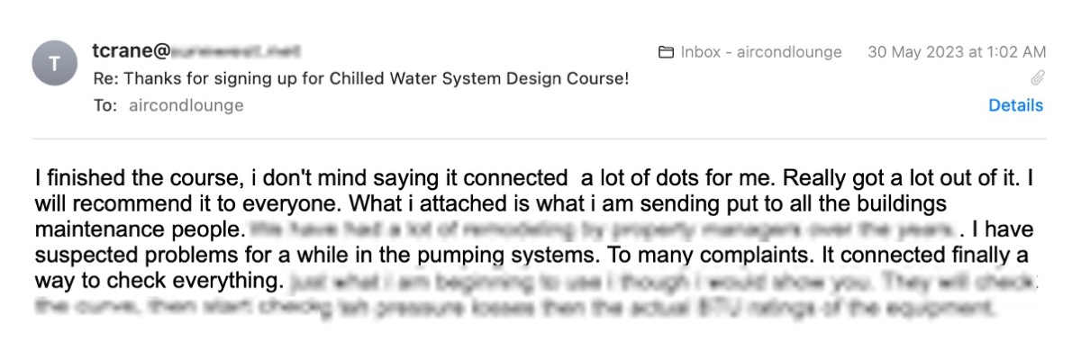 John is a chief engineer in charge of the operation and maintenance of a chilled water system. He was struggling with problematic pumps. After enrolling in this course, he learned more about pumps and found a way to solve his pump issue. He then created a troubleshooting checklist and sent to his chief engineer friends to help them solve similar problems.